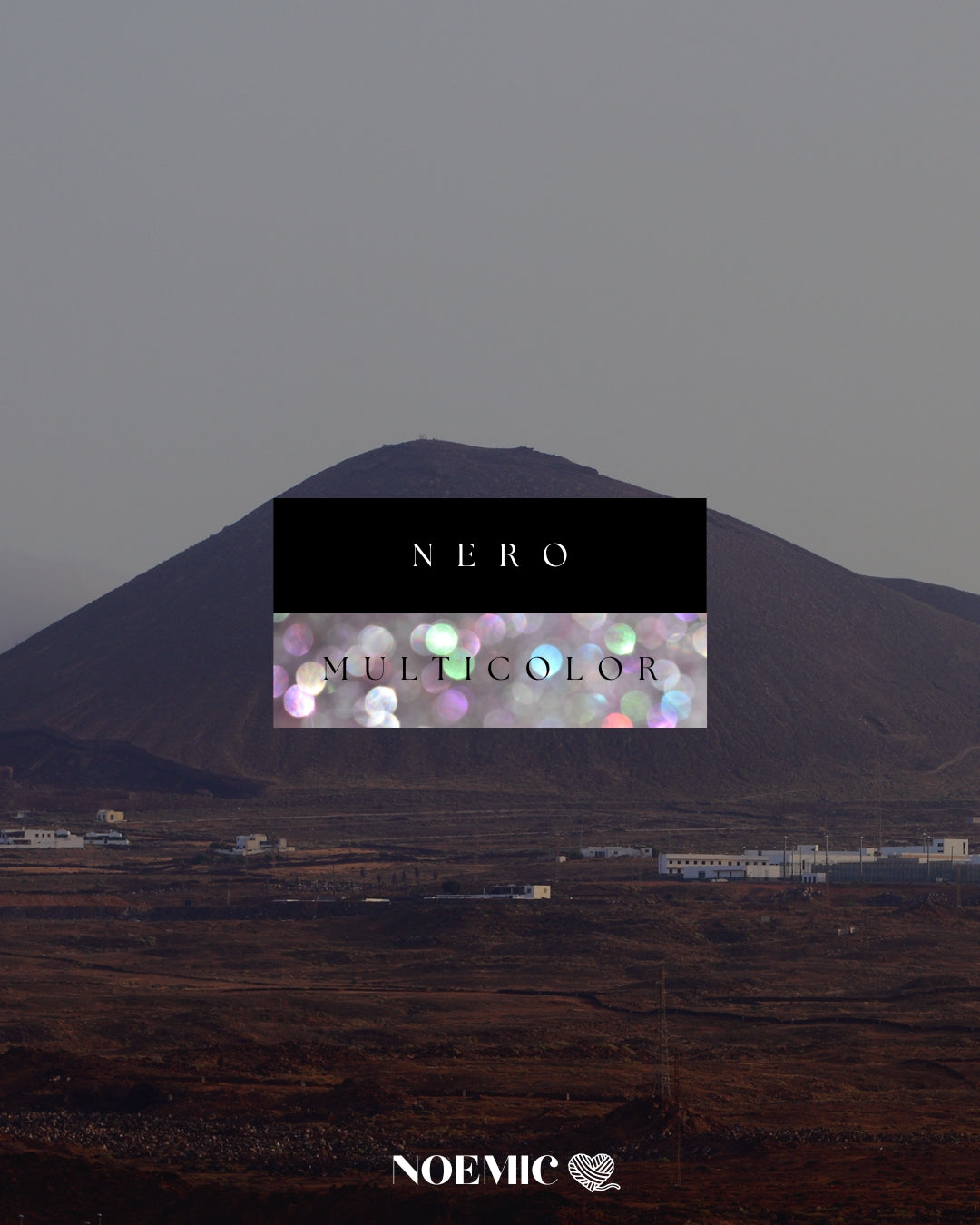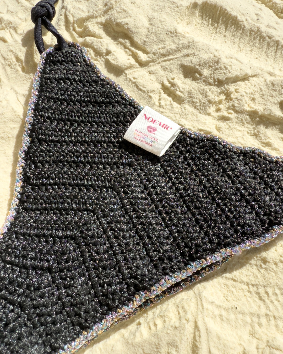 Nero profondo con bordi in lurex multicolor, ispirato ai vulcani e alle spiagge di sabbia nera.