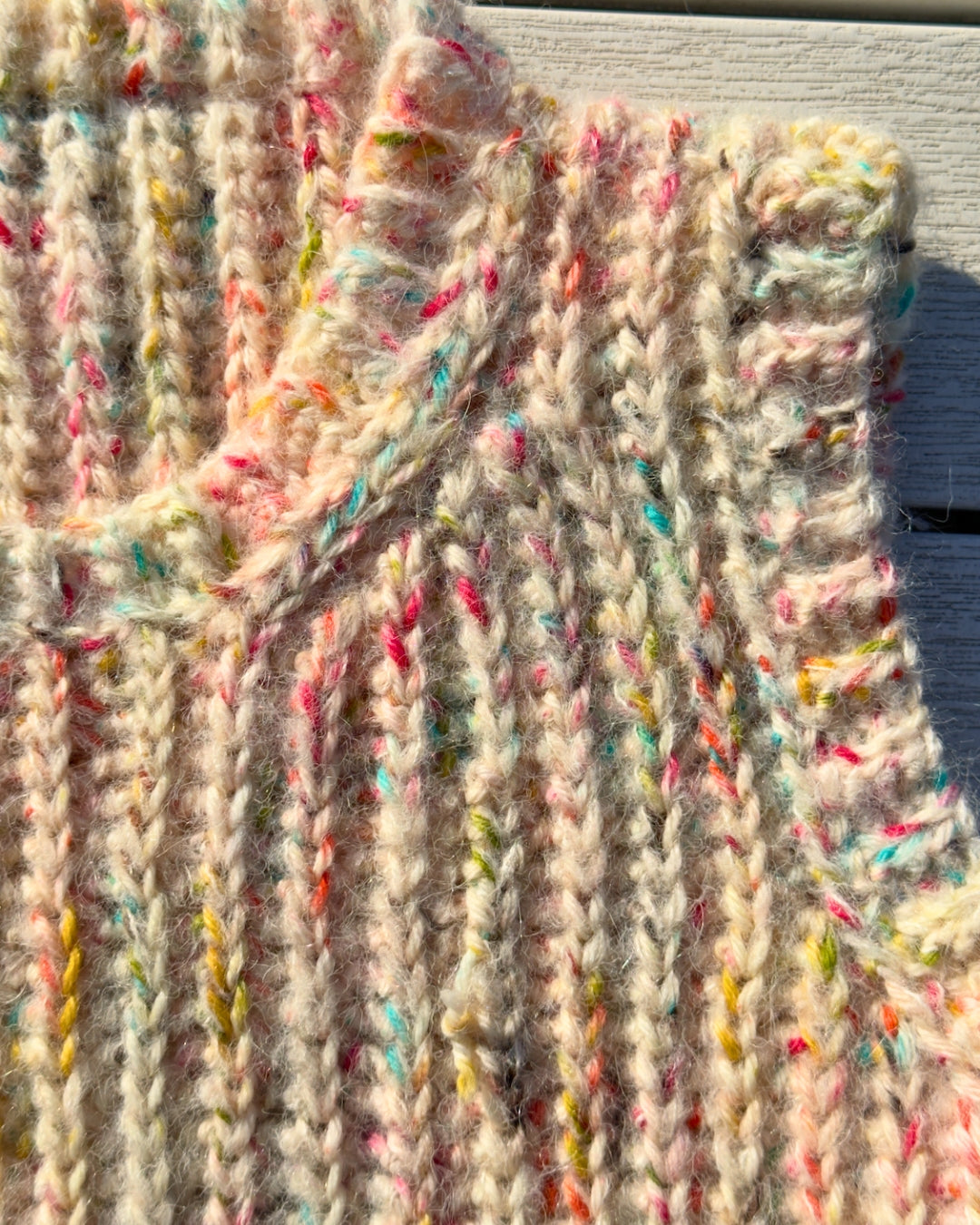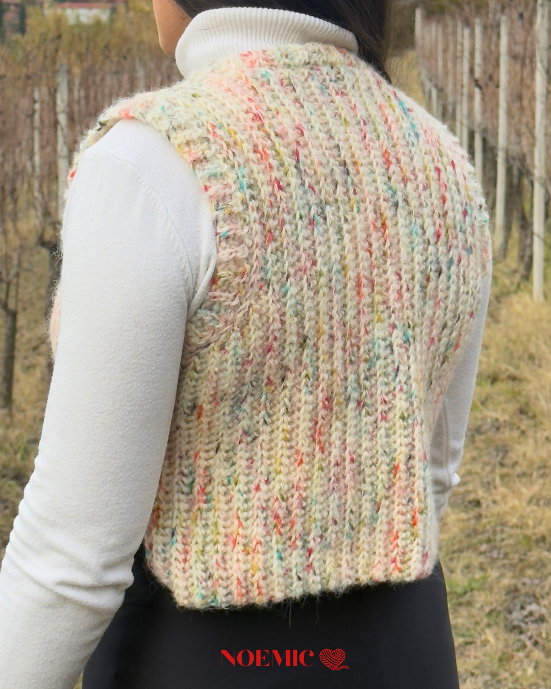 Toni panna e tocchi multicolor per un gilet che profuma di design nordico e comfort assoluto.